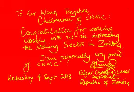 為表達(dá)對(duì)論壇成功舉行的祝賀,9月4日,倫古總統(tǒng)閣下親筆題寫(xiě)致中國(guó)有色集團(tuán)董事長(zhǎng)王彤宙的賀信,信中寫(xiě)道:“祝賀中國(guó)有色集團(tuán)和贊比亞緊密合作,共同促進(jìn)贊比亞的礦業(yè)發(fā)展,我為中國(guó)有色集團(tuán)感到自豪”。